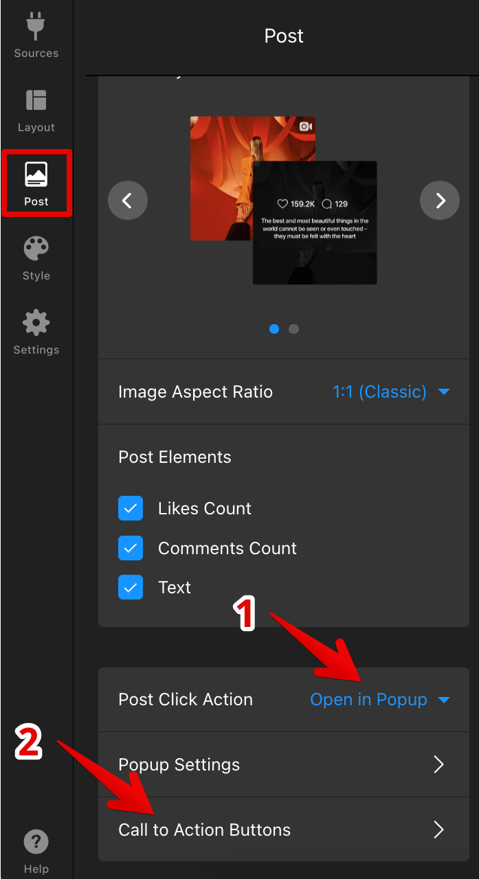 In the Post tab of your widget settings, set Post Click Action to Open in Popup. Then, click Call to Action Buttons: