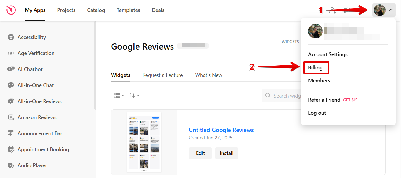 In your Elfsight account, click on the profile icon in the top-right corner, then select Billing from the dropdown menu: