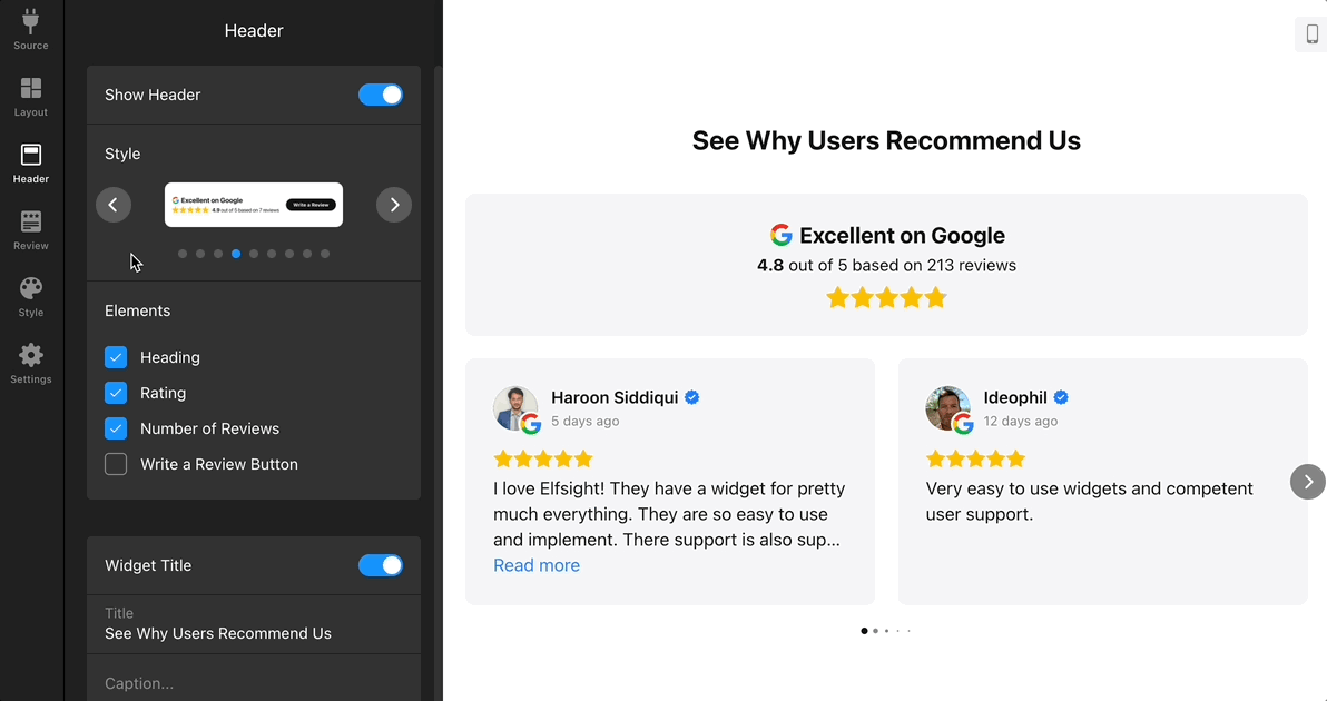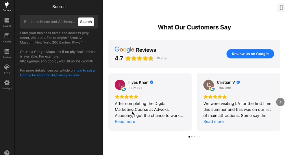 Use the Layout, Header, Review, and Style tabs to customize the widget’s appearance and ensure it aligns perfectly with your website and brand.