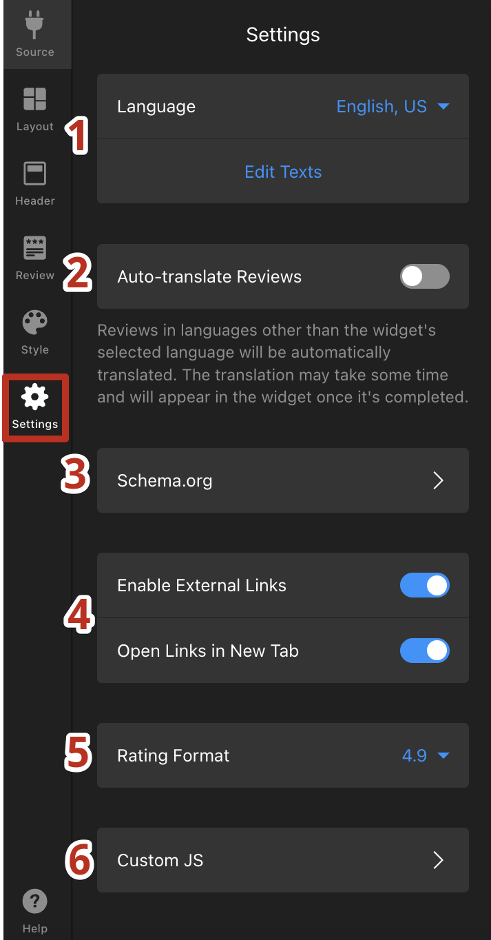 In the Settings tab, adjust options that control your widget’s language, structured data, and overall behavior:
