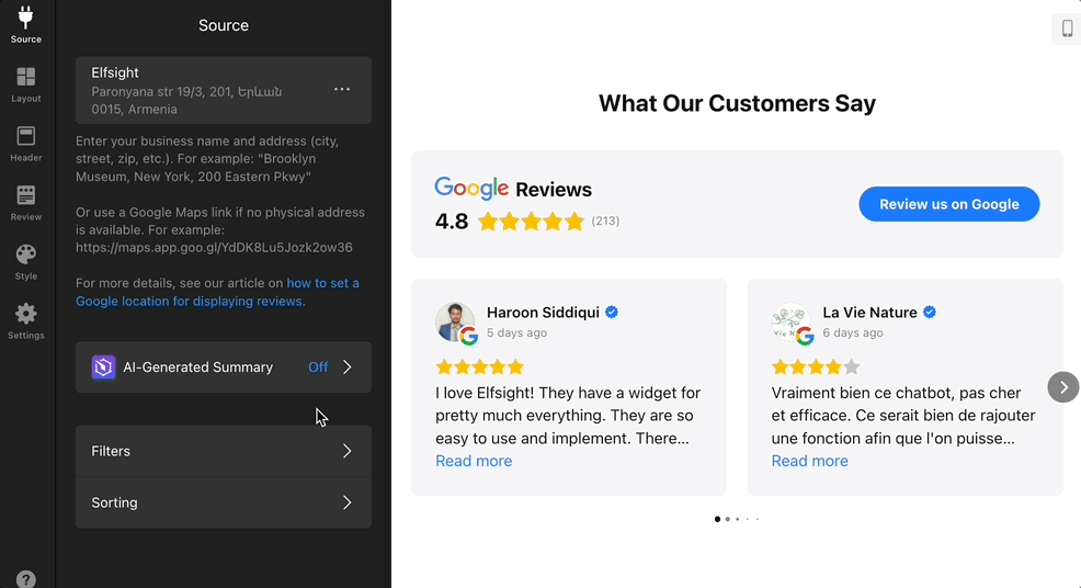 - Use AI-Generated Summary — let Elfsight analyze your reviews and show a short highlight of what customers mention most.