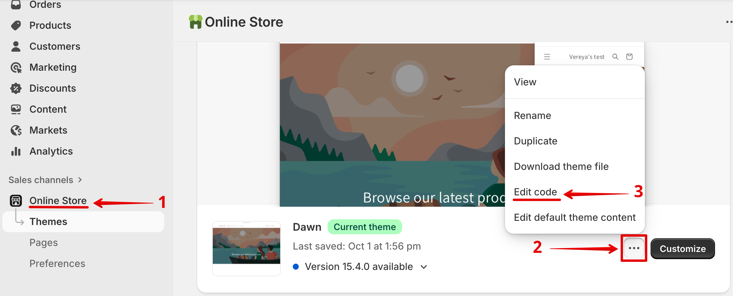In your Shopify admin panel, go to Online Store. Click the three dots button next to your website section, and choose Edit Code: