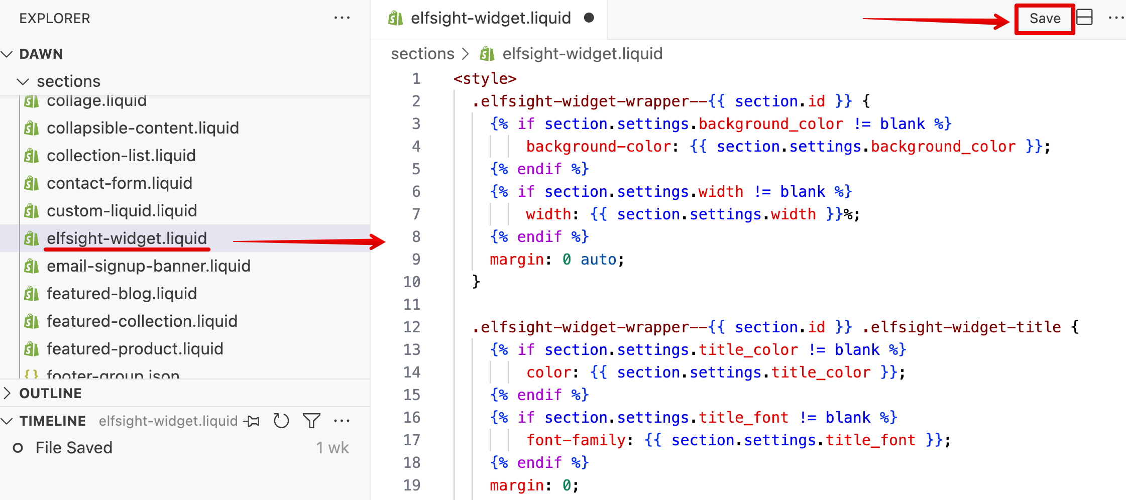 from the Sections list, and add the following code to it:<style> .elfsight-widget-wrapper--{{ section.id }} { {% if section.settings.background_color != blank %} background-color: {{ section.settings.background_color }}; {% endif %} {% if section.settings.width != blank %} width: {{ section.settings.width }}%; {% endif %} margin: 0 auto; } .elfsight-widget-wrapper--{{ section.id }} .elfsight-widget-title { {% if section.settings.title_color != blank %} color: {{ section.settings.title_color }}; {% endif %} {% if section.settings.title_font != blank %} font-family: {{ section.settings.title_font }}; {% endif %} margin: 0; padding: 20px; } </style> <div class="elfsight-widget-wrapper elfsight-widget-wrapper--{{ section.id }}">{% if section.settings.title != blank %}<h2 class="elfsight-widget-title text-center"> {{ section.settings.title | escape }}</h2> {% endif %} {% if section.settings.code != blank %} {{ section.settings.code }} {% endif %}</div> {% schema %}{"name":"Elfsight widget","settings":[{"type":"header","content":"Title"},{"type":"text","id":"title","label":"Heading"},{"type":"color","id":"title_color","label":"Title color","default":"#3a3a3a"},{"type":"text","id":"title_font","label":"Title font"},{"type":"header","content":"Layout"},{"type":"range","id":"width","label":"Width of section","min":10,"max":100,"unit":"%","default":100},{"type":"color","id":"background_color","label":"Background color"},{"type":"header","content":"Widget"},{"type":"textarea","id":"code","label":"Installation code"}],"presets":[{"category":"Advanced layout","name":"Elfsight widget"}]}{% endschema %}