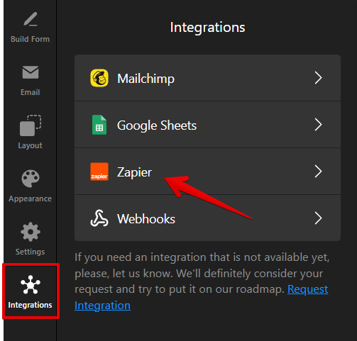 Open the Integrations tab and choose Zapier: