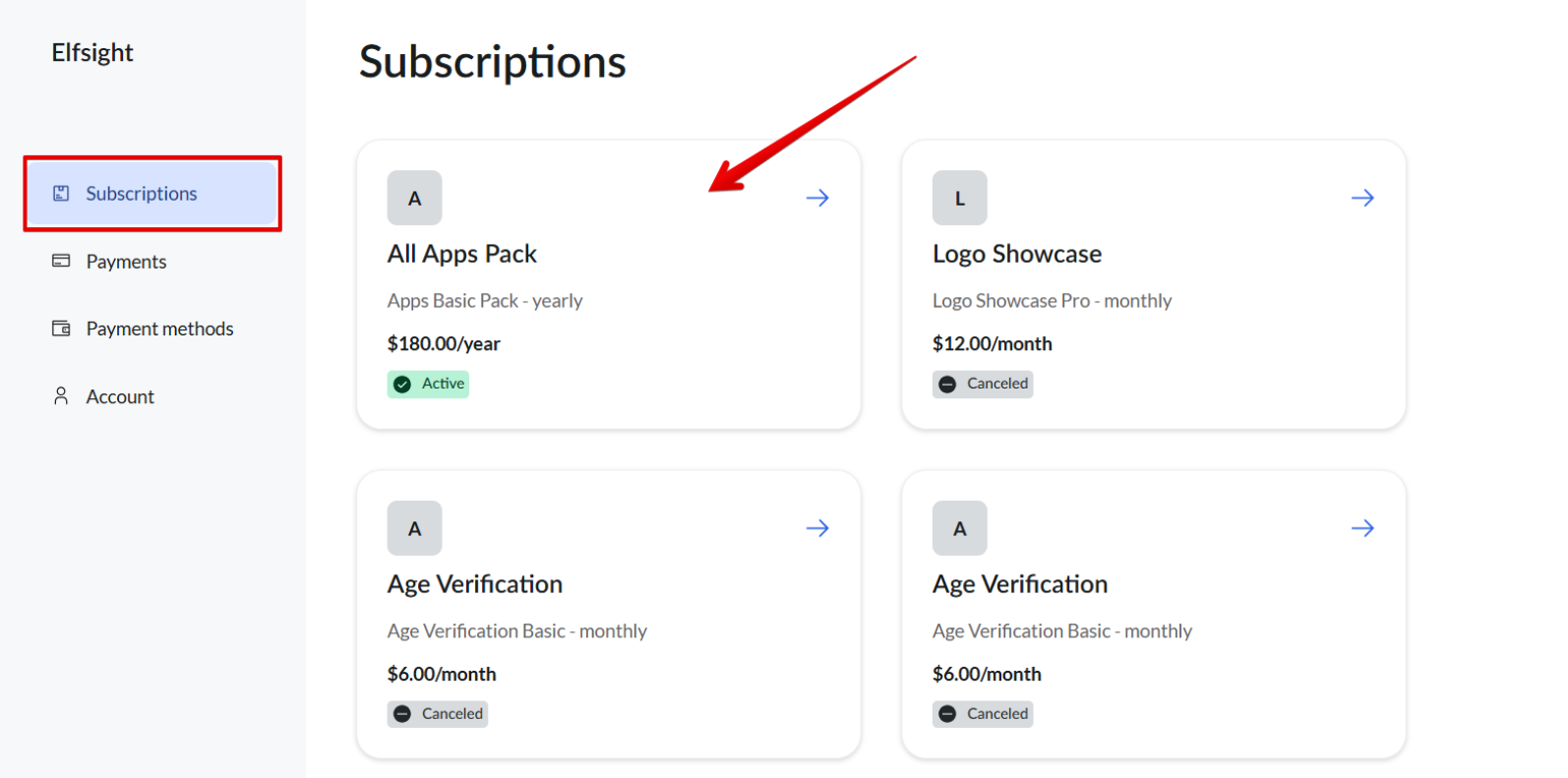 Log in to the Paddle Customer Portal using the link in your Elfsight subscription confirmation email or the direct portal link.