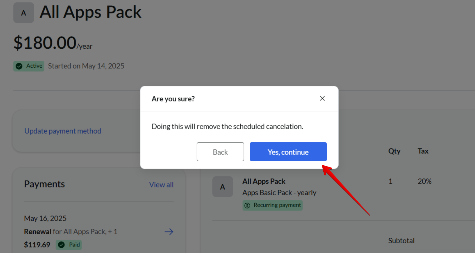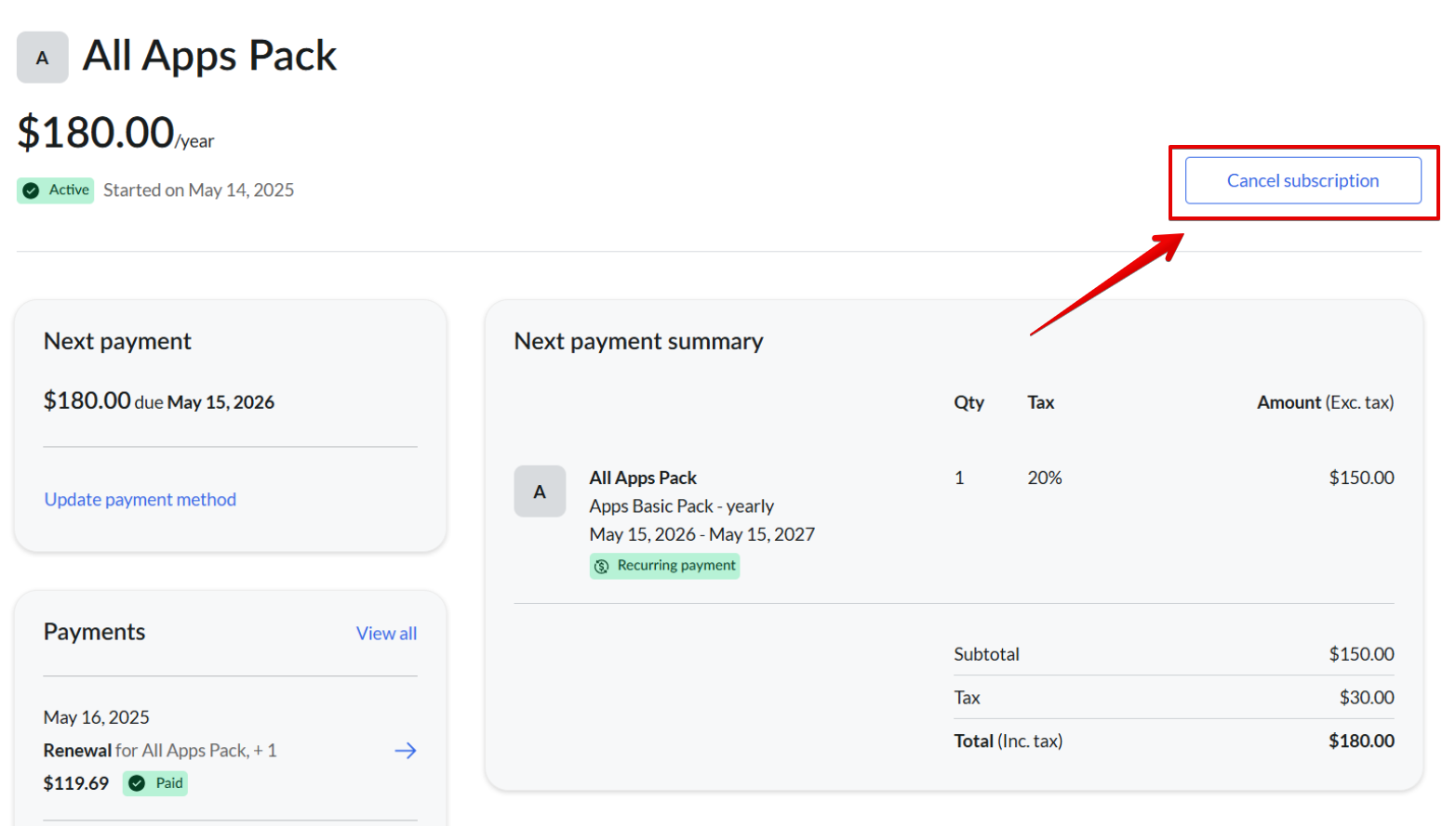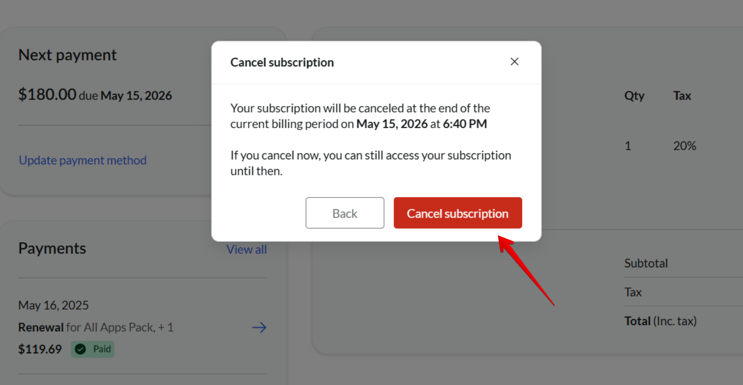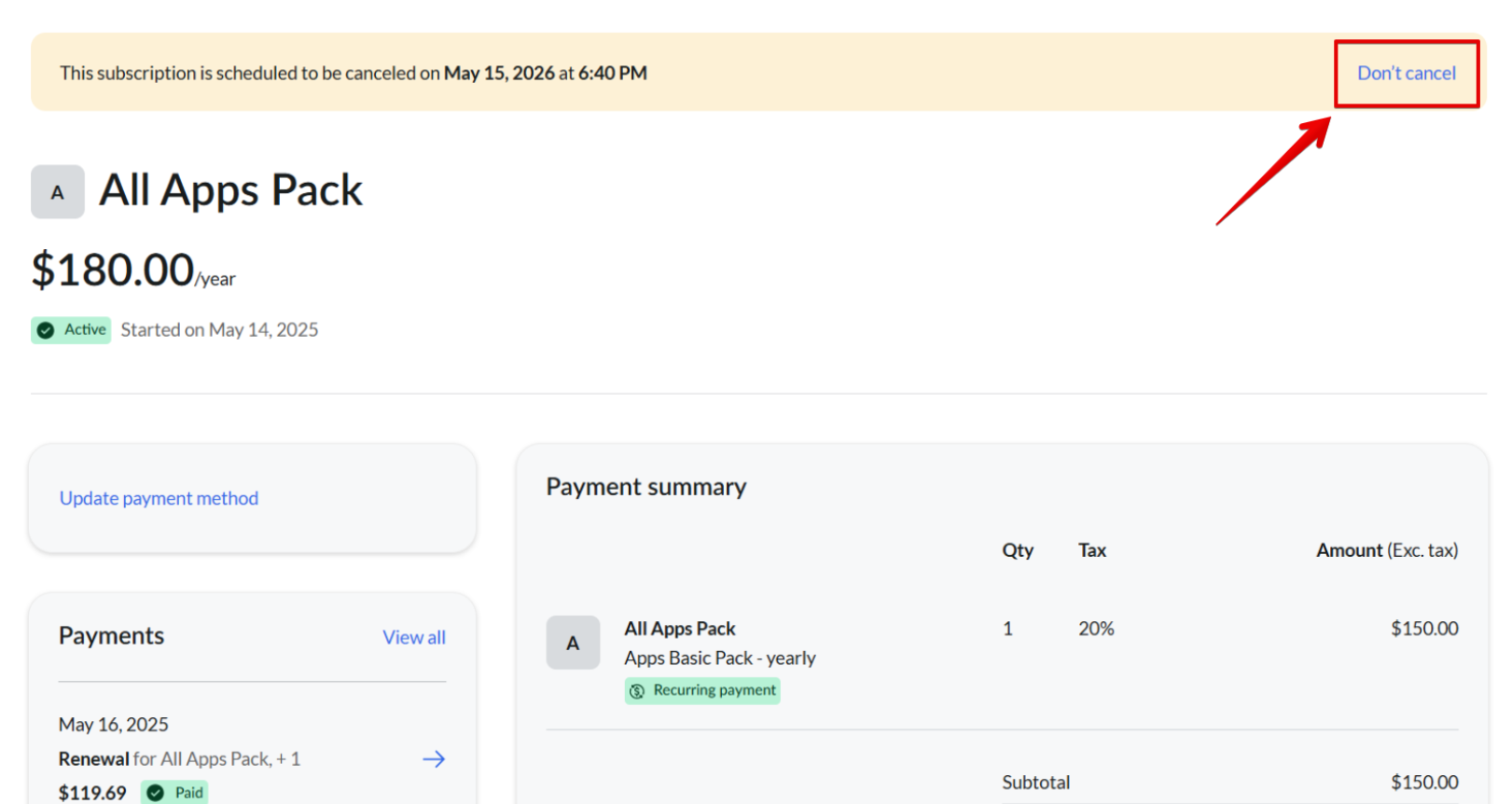 That's it! You won’t be charged again for this subscription. You'll continue to have access to paid features until the end of the current billing period. After that, your subscription will be fully terminated and automatically switched to the Free plan.
