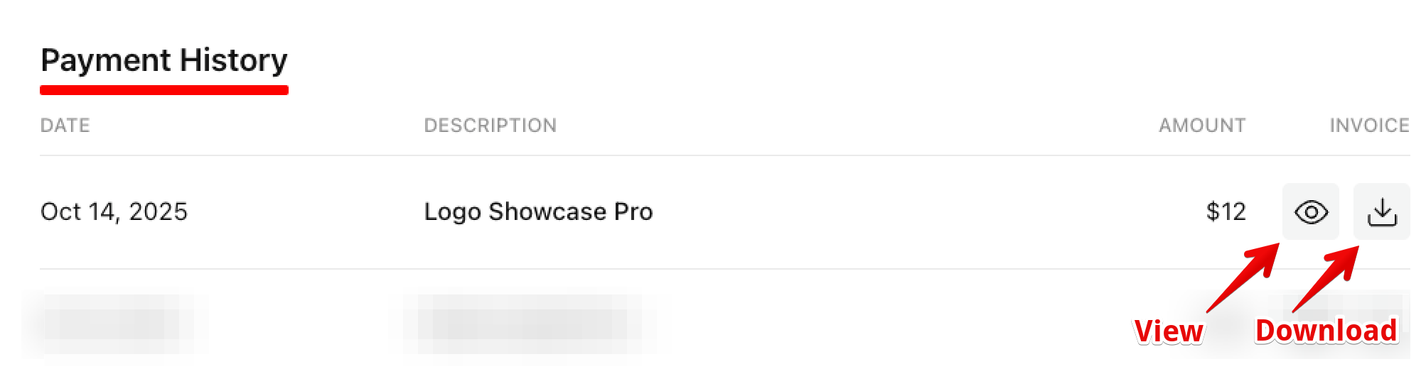 In the Payment History section, click the View icon to open your invoice or Download to save it as a PDF: