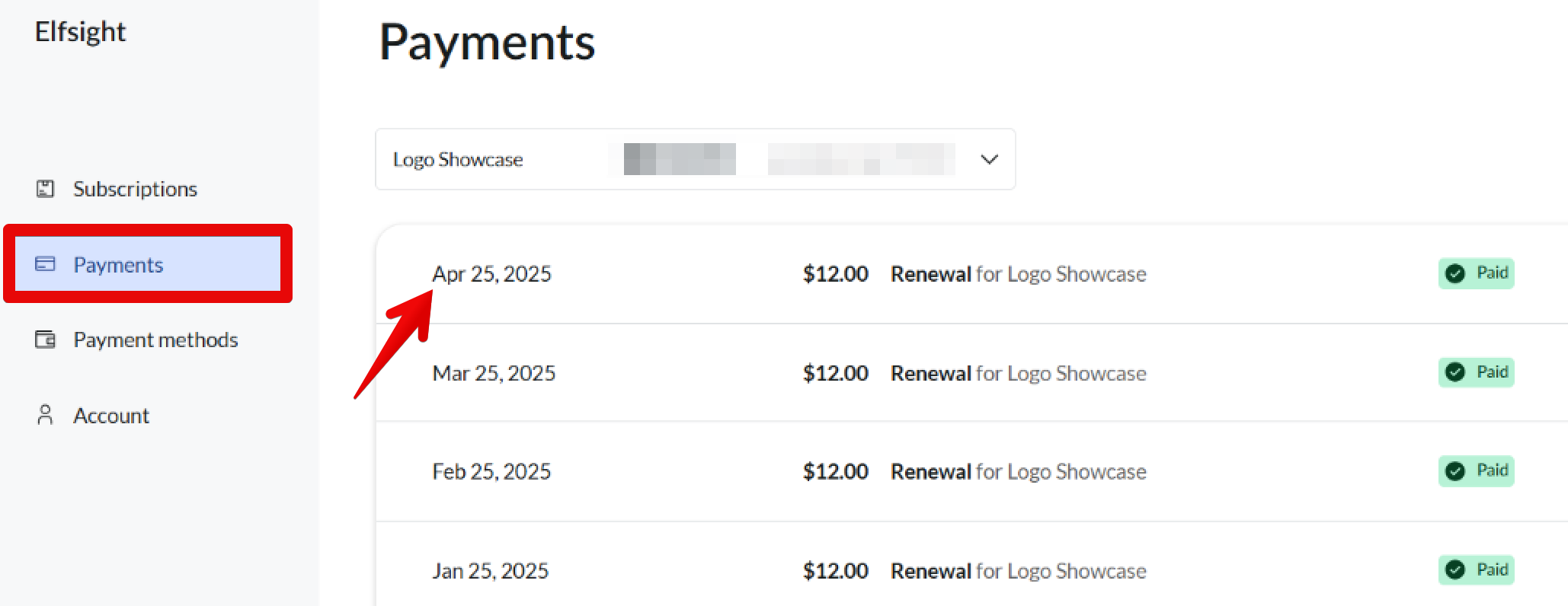 You can easily view your subscription history and invoices directly from your Elfsight account. Follow these steps to access your invoice: