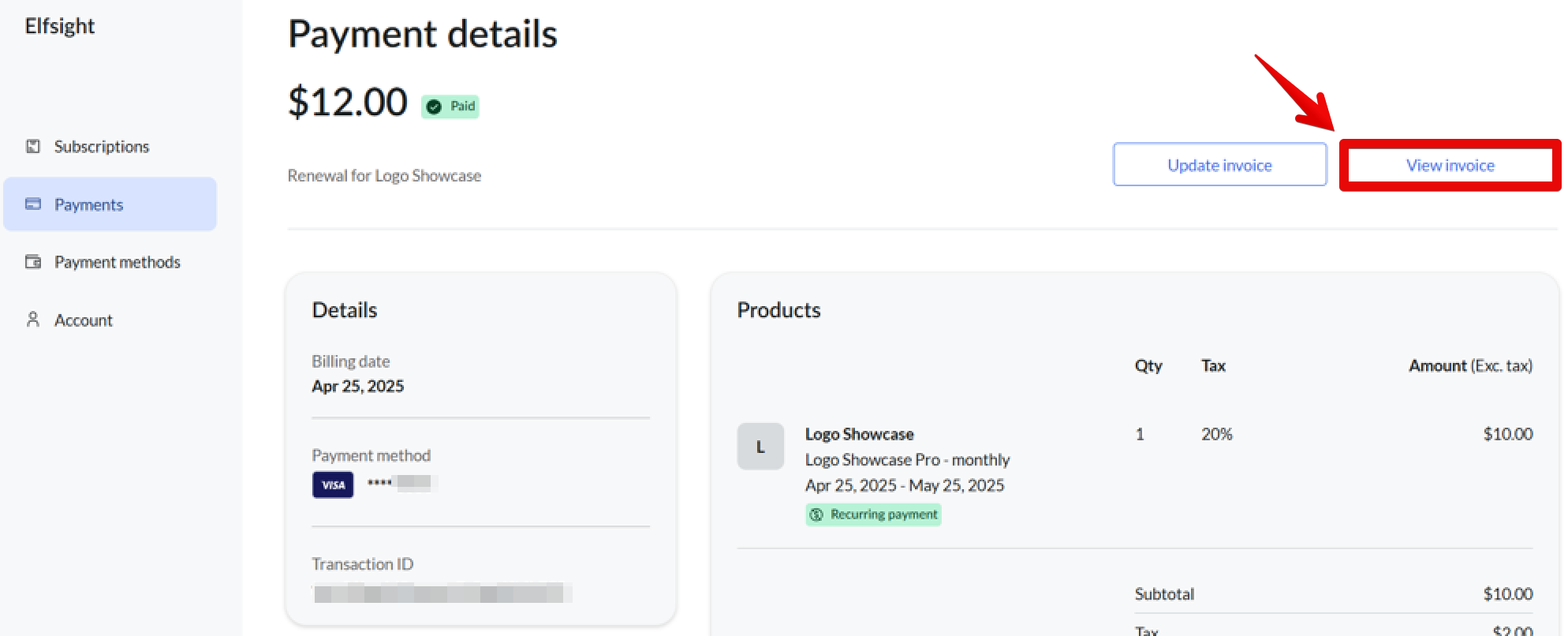 After subscribing to a paid plan, your invoice will be sent to the email you provided at checkout. It will also be available in your Elfsight Dashboard and in the Paddle Customer Portal — a secure platform where you can manage your purchases and subscriptions.