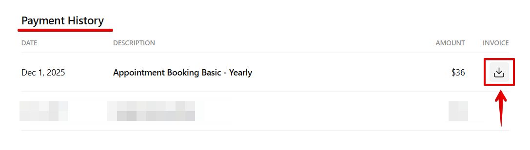 In the Payment History section, click the Download icon to save your invoice as a PDF: