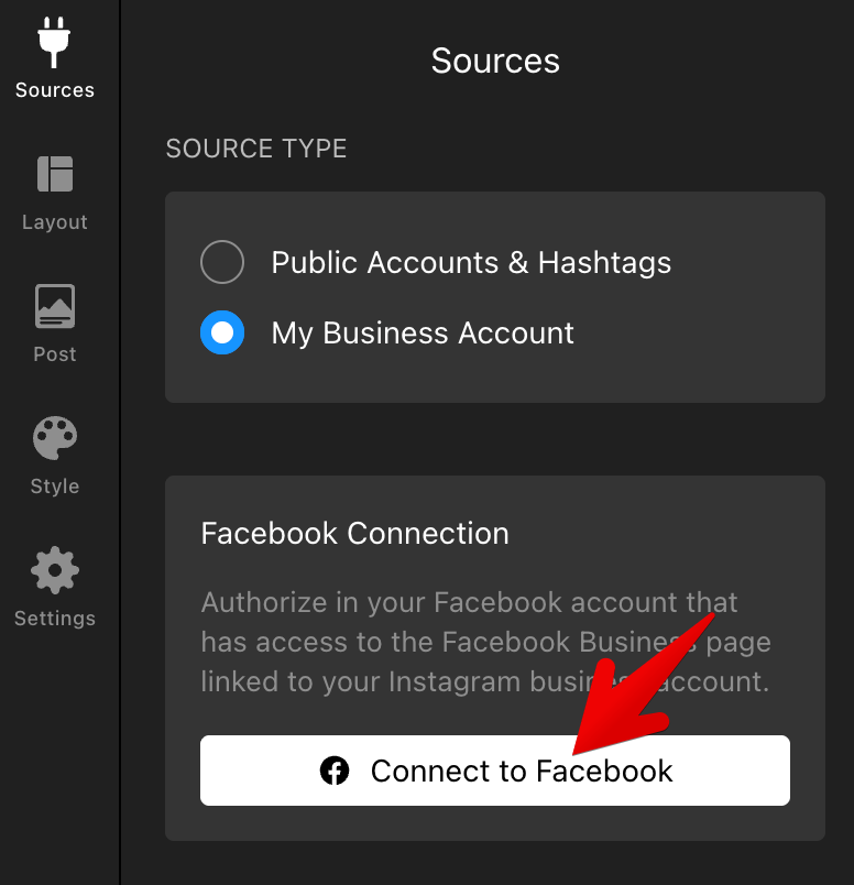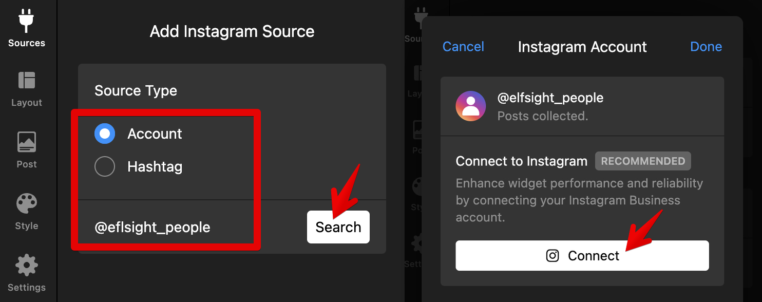 Add your username into the Source Type field and click Search. Once the search is complete and the posts are collected, click Connect: