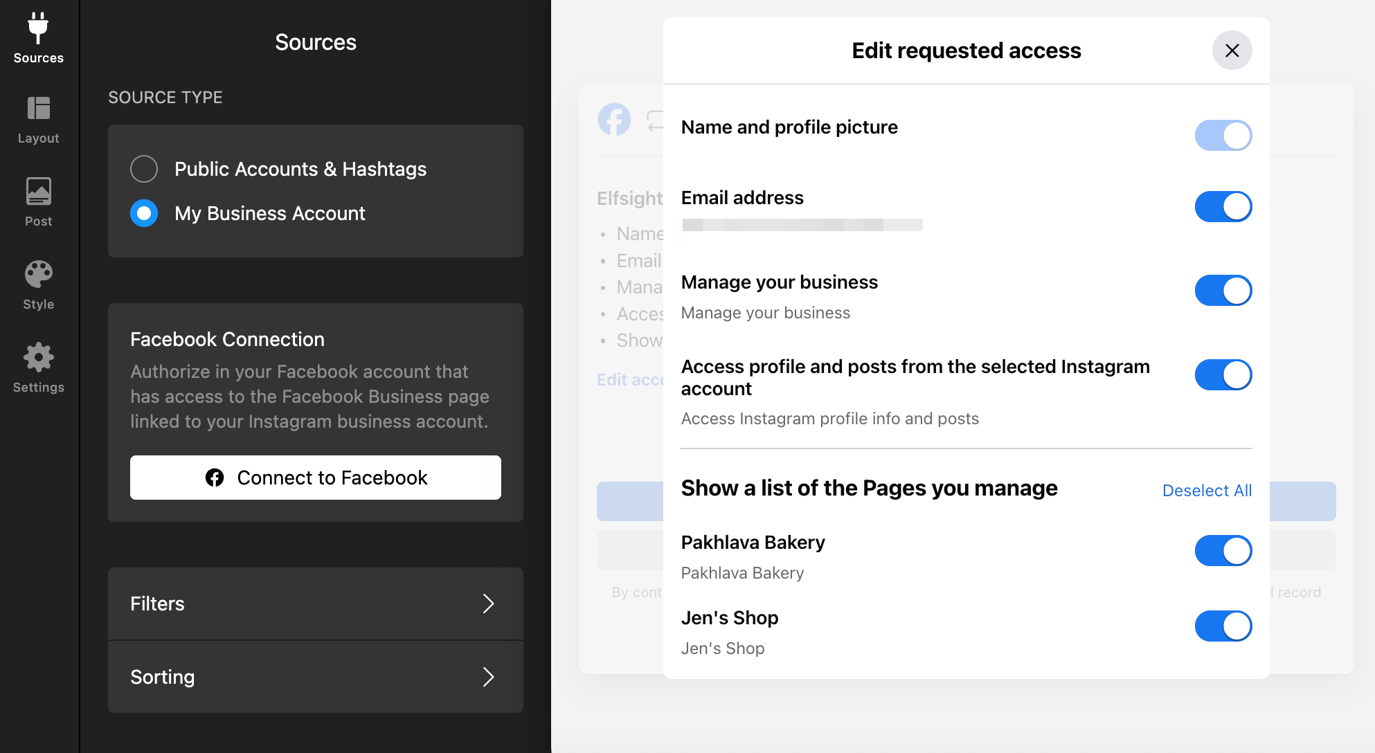 Make sure all toggles are on. If any are disabled, Facebook may not grant full permissions, which can cause the connection to fail: