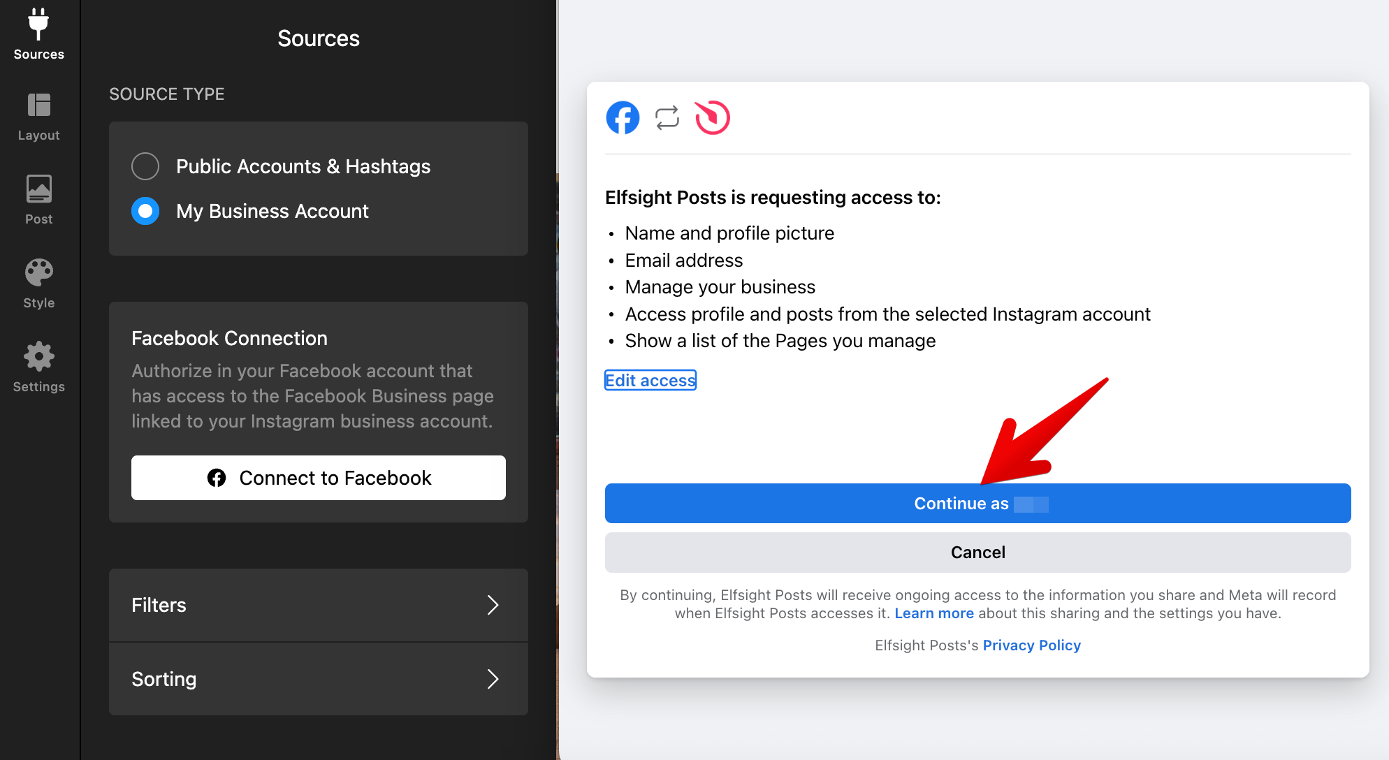 Log in to your Instagram account in the pop-up window that appears: