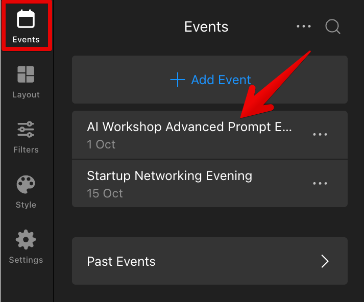 Open your widget editor, go to the Events tab, and select the event you want to make recurring: