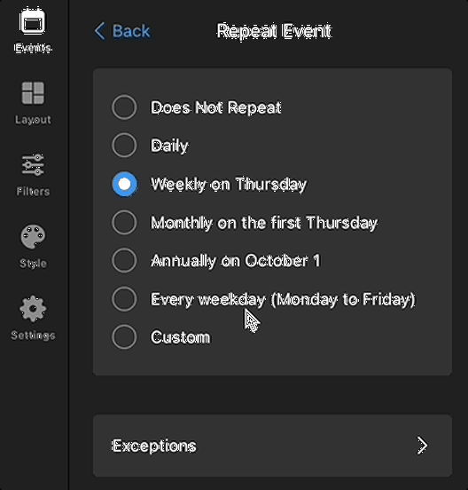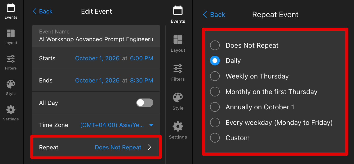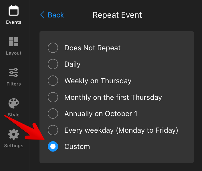 If none of the preset repeat options fit your needs, select Custom in the Repeat Event section. This allows you to fully control how often your event repeats: