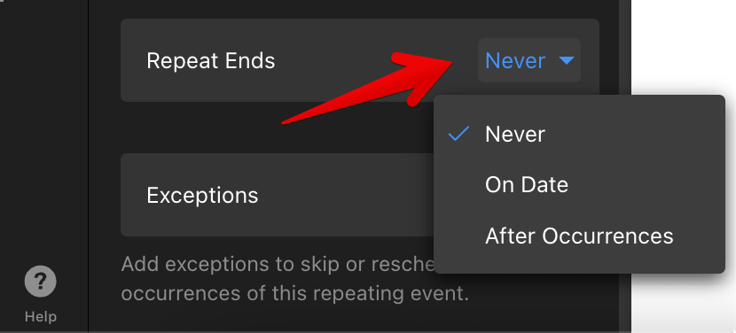 You can also decide when the repetition should stop. In the Repeat Ends setting, choose one of three options: