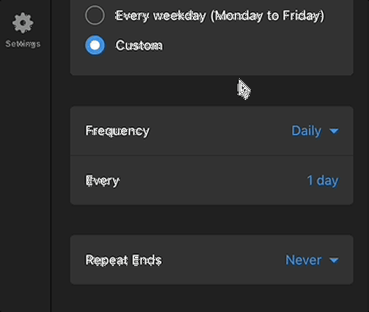 You can choose the Frequency (Daily, Weekly, Monthly, or Yearly) and specify how often it repeats — for example, every 3 days, every 2 weeks, or every 4 years: