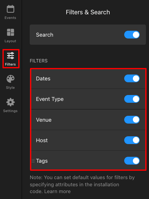These attributes, when added to the widget installation code, set which filter (Dates, Event Type, Venue, Host, Tags, or Search value) will be selected automatically when the widget loads.