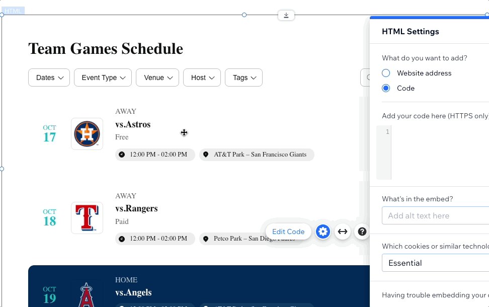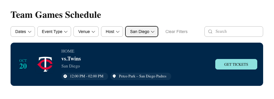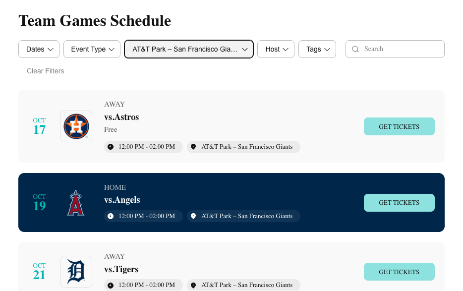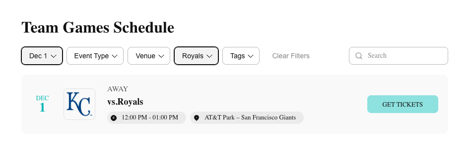 This code pre-selects the Venue filter for “AT&T Park – San Francisco Giants”: