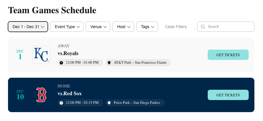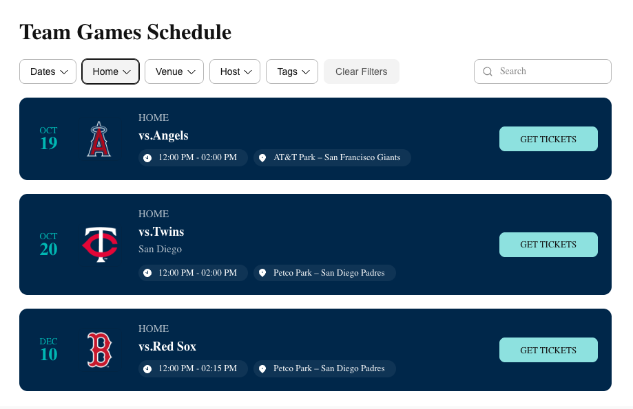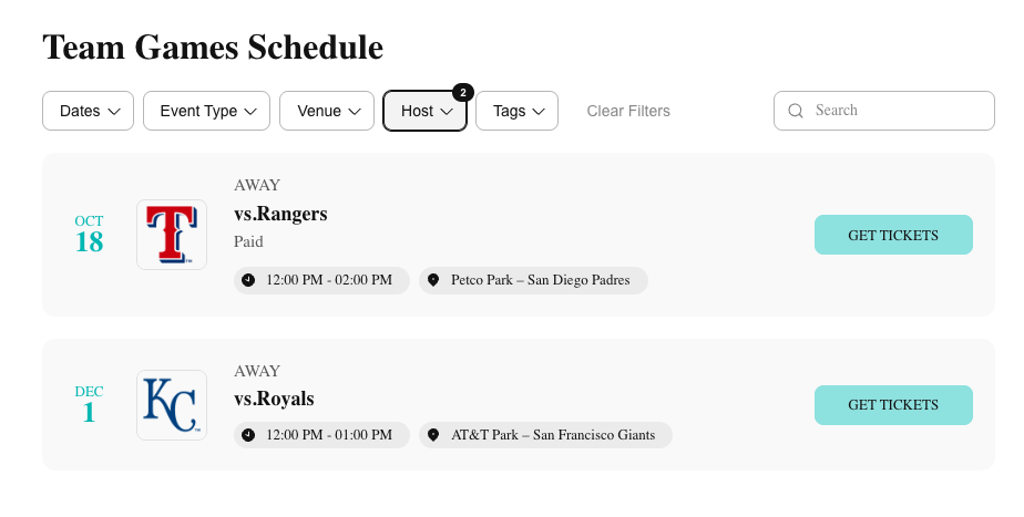 <script src="https://elfsightcdn.com/platform.js" async></script> <div class="elfsight-app-WIDGET_ID" data-elfsight-app-lazy data-elfsight-app-filter-venue="AT&T Park – San Francisco Giants"></div>