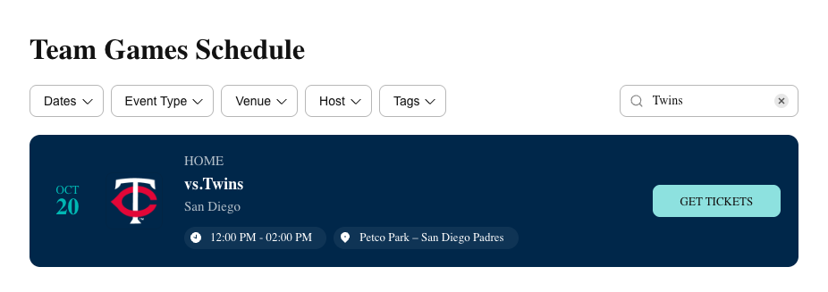 For displaying events filtered by specific Search criteria—such as the keyword 'Twins'—use the following installation code: