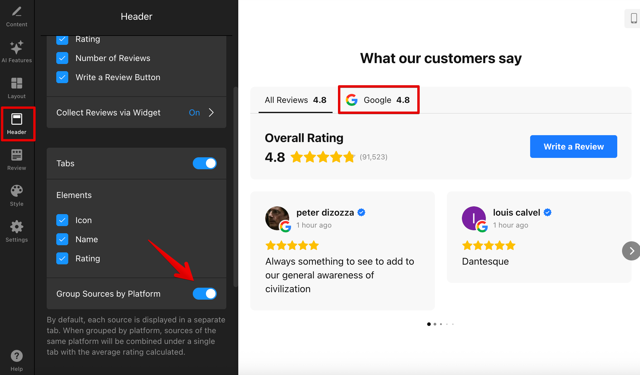 You can also merge multiple sources from the same platform into a single tab. Go to the Header tab and toggle on Group Sources by Platform: