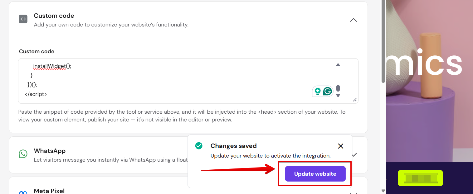 Then hit Update website to publish the widget: