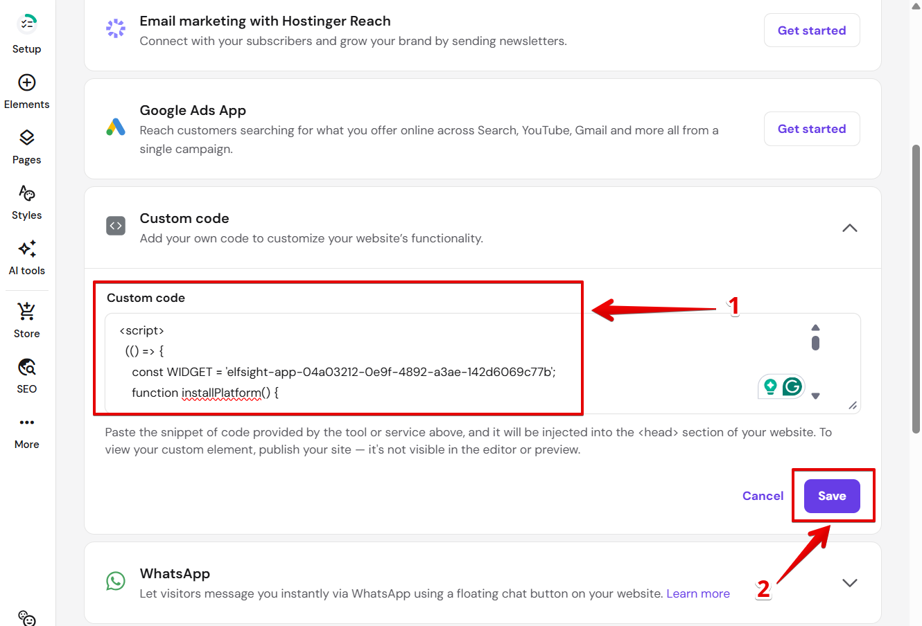 Adding Elfsight widget to Hostinger website