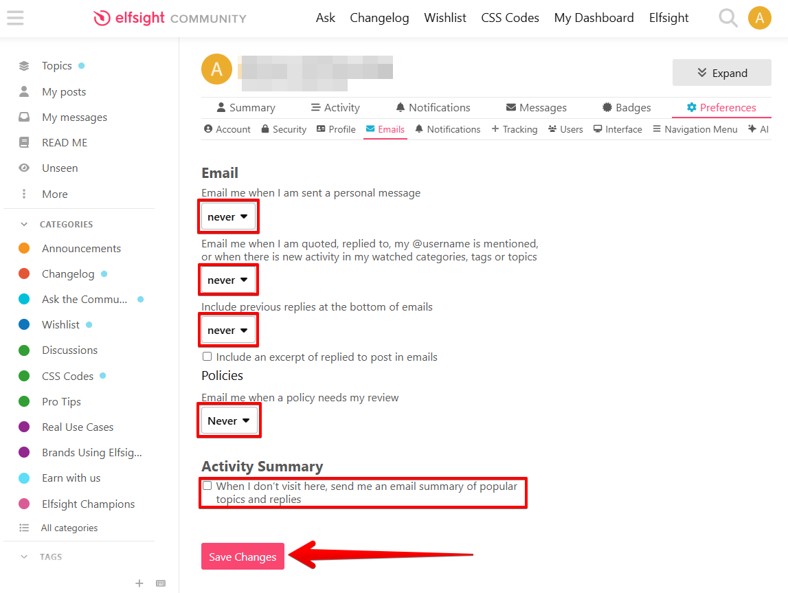 Set all dropdowns to Never and uncheck the Activity Summary checkbox. Then click Save Changes: