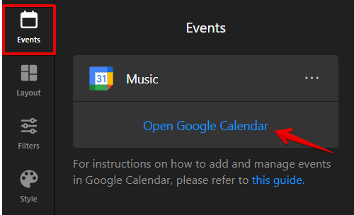 To manage synced events, click Open Google Calendar. This will open the Google Calendar connected to your widget, where you can edit your events:
