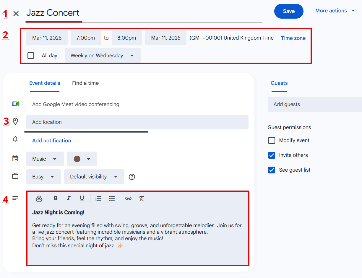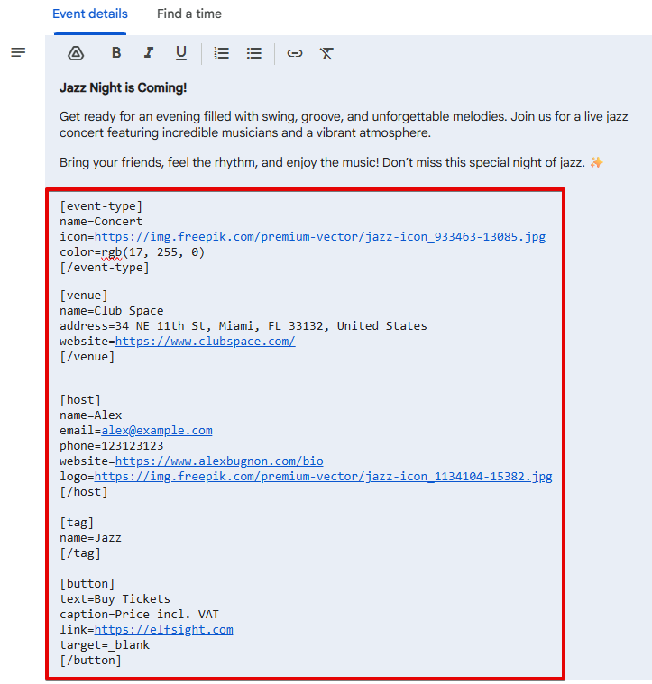 Some Event Calendar details, such as hosts, images, buttons, and files, are not available as basic Google Calendar fields. To display them in the widget, you can add special tags to the Google Calendar event’s Description field.