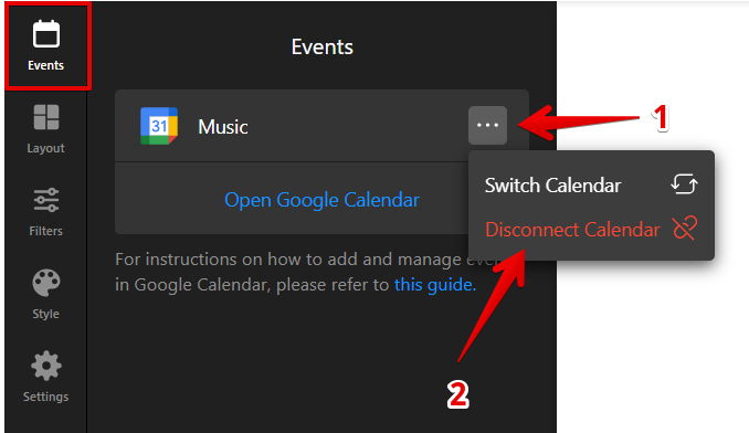 In the Events tab, click the three-dots menu icon and select Disconnect Calendar:
