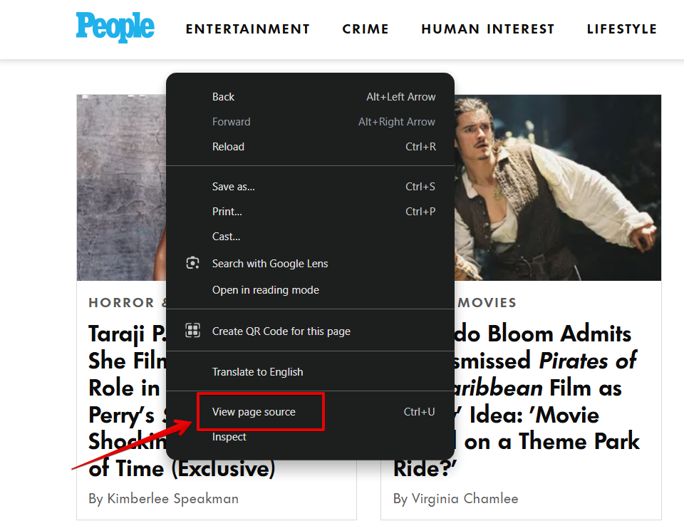 Open the website of your choice and right-click anywhere on the page. Select View Page Source: