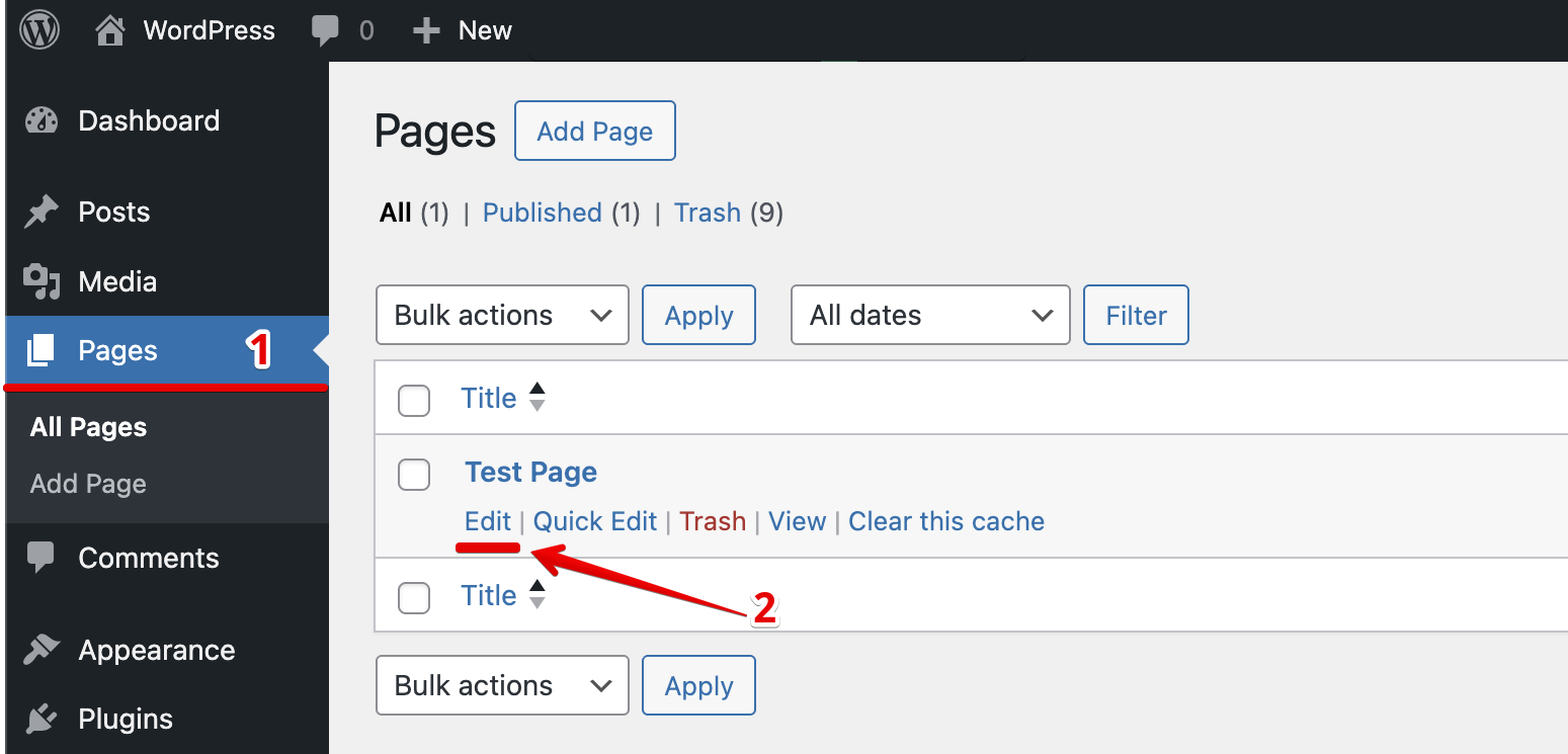Log in to your WordPress website backend and click on Pages. Find the needed page, hover over its title, and click Edit: