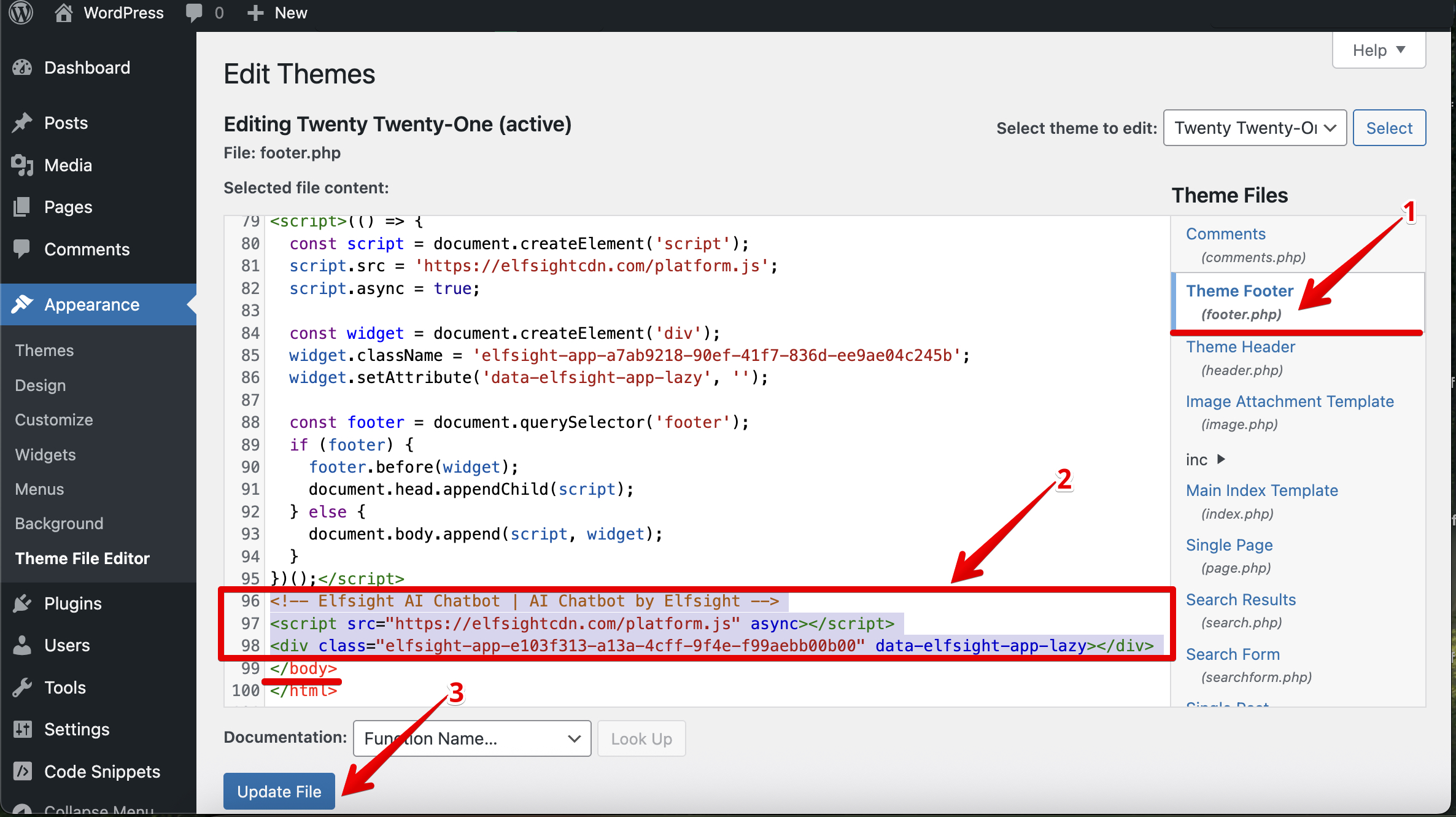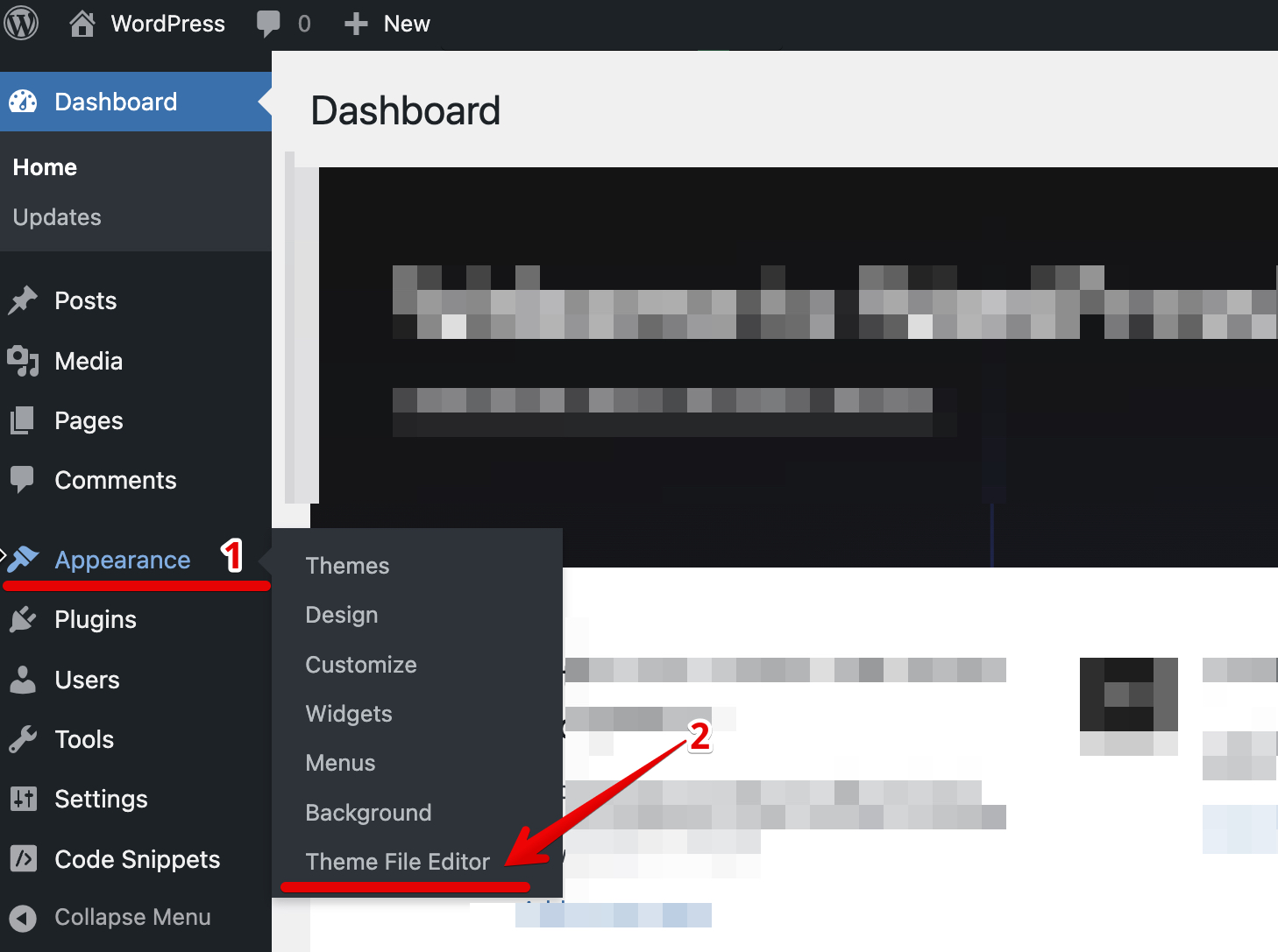 Log in to your WordPress website backend. In the left-hand menu, select Appearance → Theme File Editor: