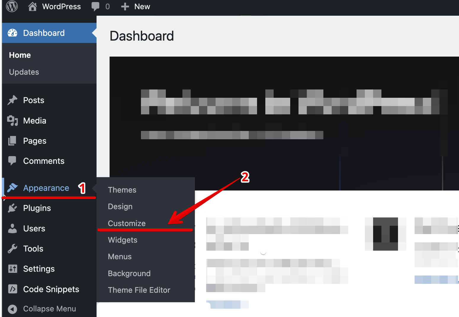 Log in to your WordPress website backend. Go to the Appearance tab in the left-hand menu and click Customize: