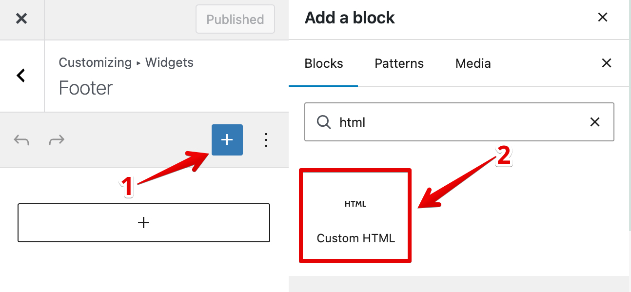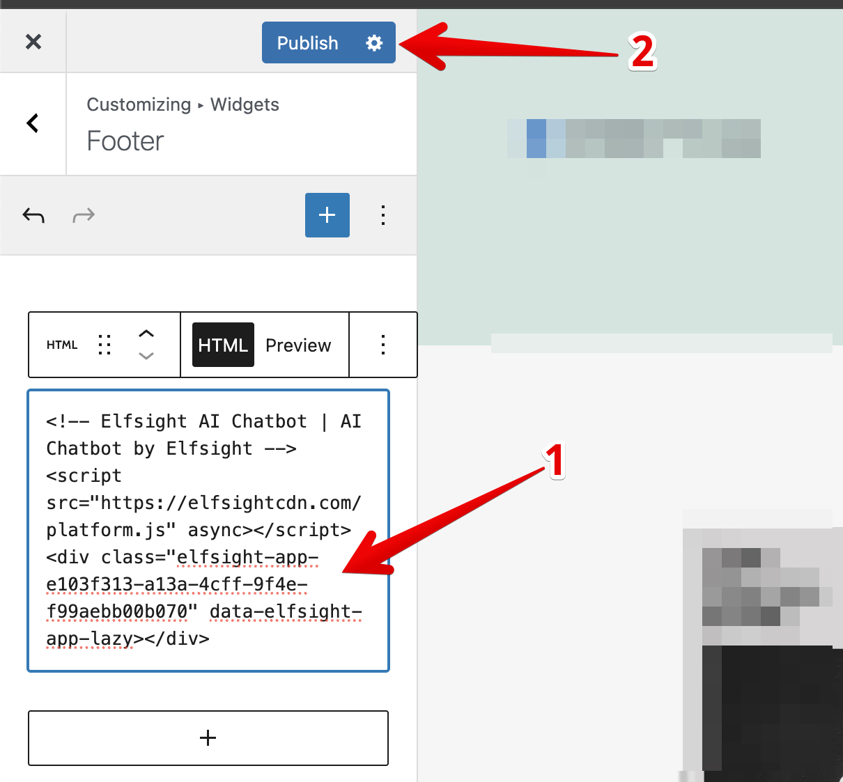Paste your widget installation code into the HTML field and click Publish to apply the changes: