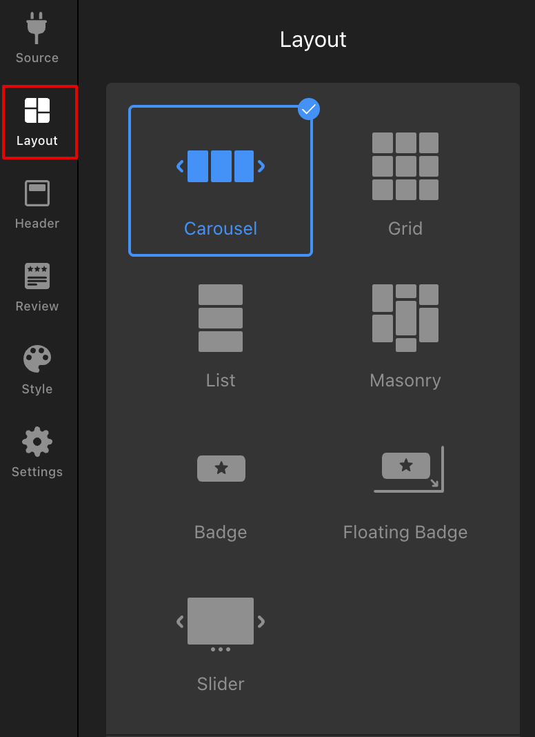 In the Layout tab, you can select how reviews are displayed: Carousel, Grid, List, Masonry, Badge, Floating Badge, or Slider.