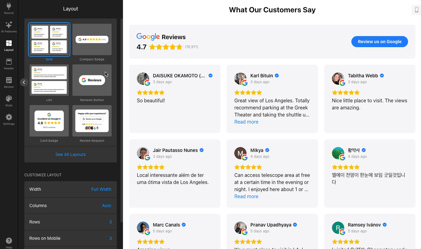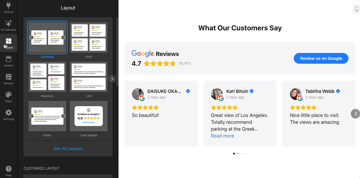 In the Layout tab, you can select how reviews are displayed — Carousel, Masonry, Slider, Grid, List, Reviews Button, Review Request, Card or Compact Badge (to see all available options, click See All Layouts):