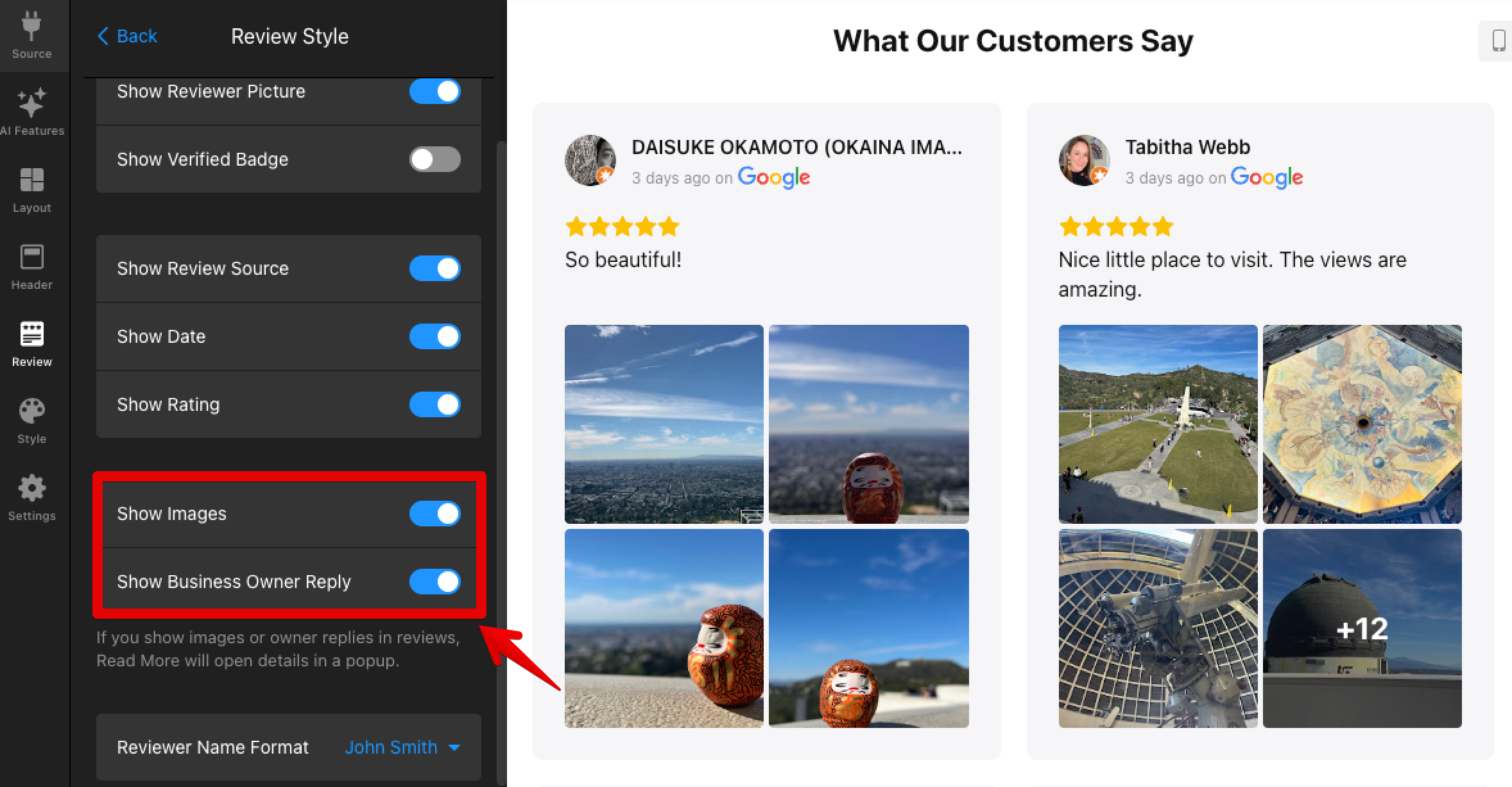 The Google source also supports reviewer images and business owner replies! 🚀 Here's how it looks in the widget: