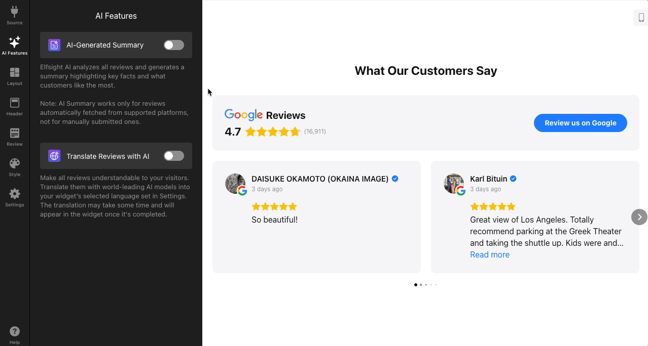 In the AI Features tab, enable AI-Generated Summary to automatically generate a short highlight of your reviews. Choose your preferred Summary Style and toggle Text Typing and AI Picture Animation on or off: