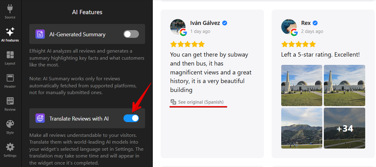 You can also display reviews in your selected widget language! Simply enable the Translate Reviews with AI toggle. Your site visitors will be able to view the original review text in the popup: