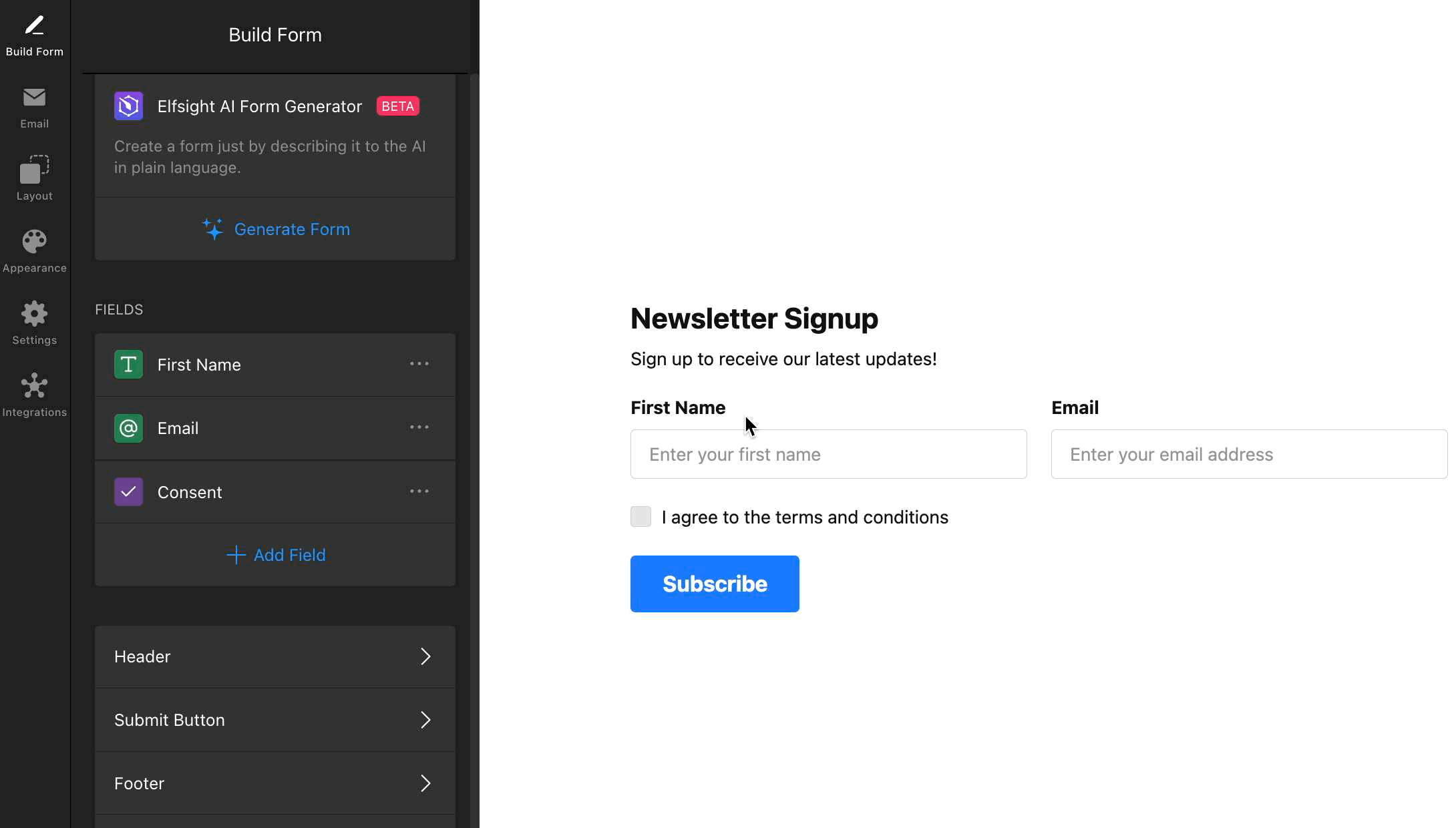 Add extra information or links (like privacy policies or contact info) to the form’s Footer. Enable or disable it as needed: