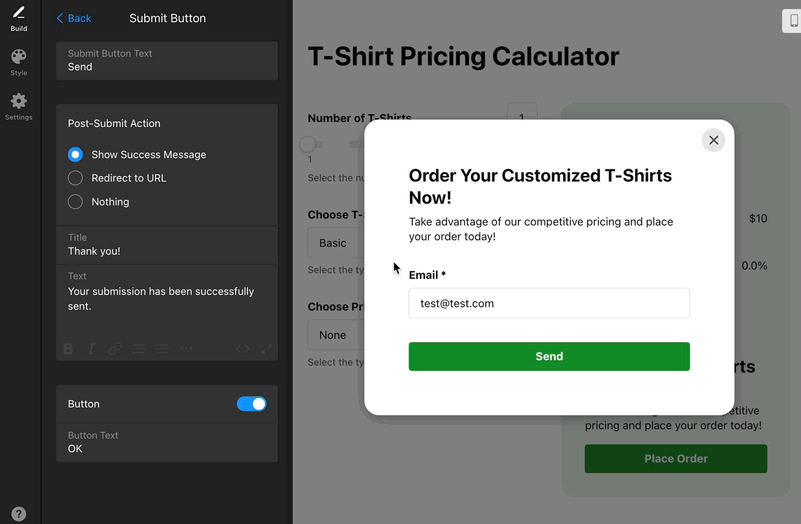 - Show Success Message displays a confirmation message after user submits the form. You can edit its Title and Text and optionally show a close Button with custom text: