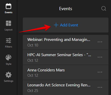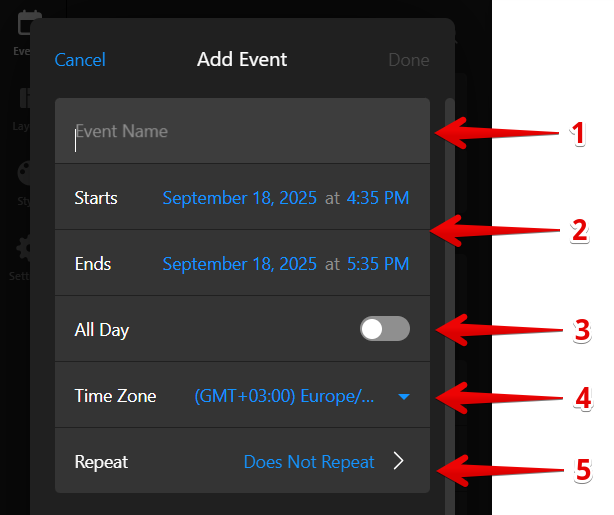 Click the ➕ Add Event button to open the editor where you can fill out the event details: Here’s a breakdown of the options you can customize: