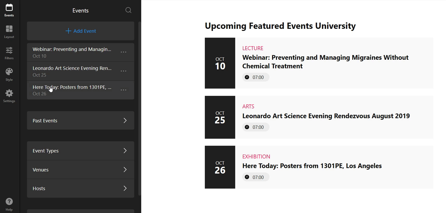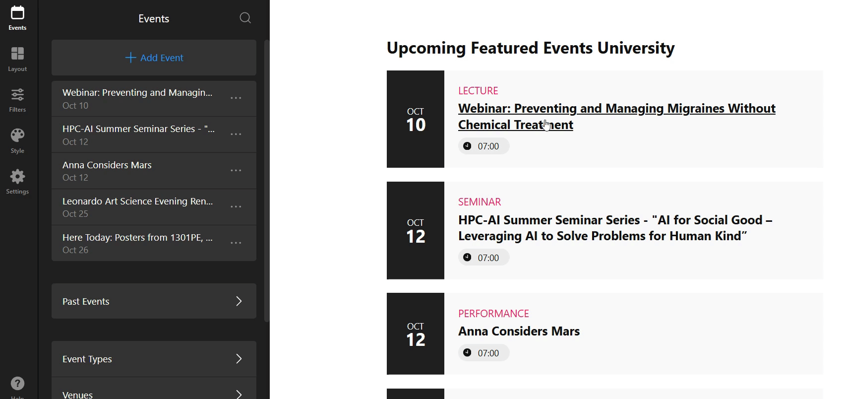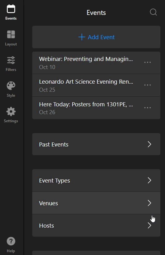 Once you've added Event Types, Venues, and Hosts, you can now apply them to individual events or set up filters in the Filters tab for easier sorting:
