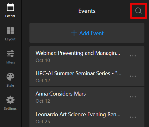 Alternatively, you can use the Search feature to quickly find events by name or description: