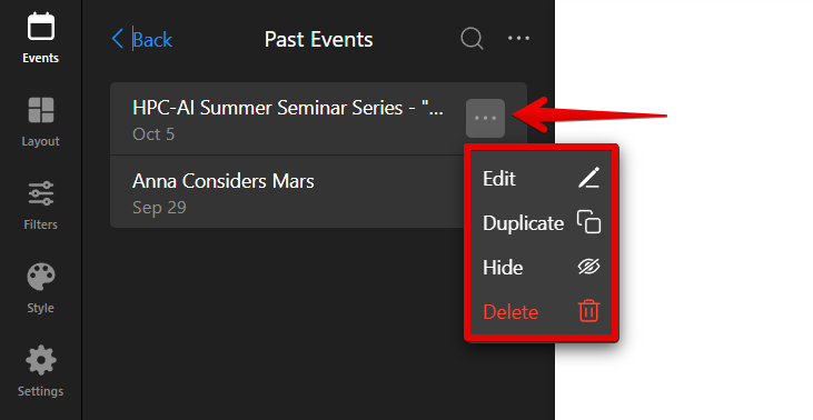 - Edit Past Events — You can also edit individual past events. Click the three dots next to the event you wish to modify, and you’ll have the option to Edit, Duplicate, Hide or Delete the event using the dropdown menu: