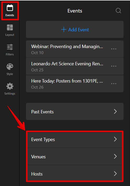 Now, let's set up Event Types, Venues, and Hosts for your events. Each of these can be configured in separate sections: