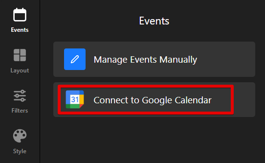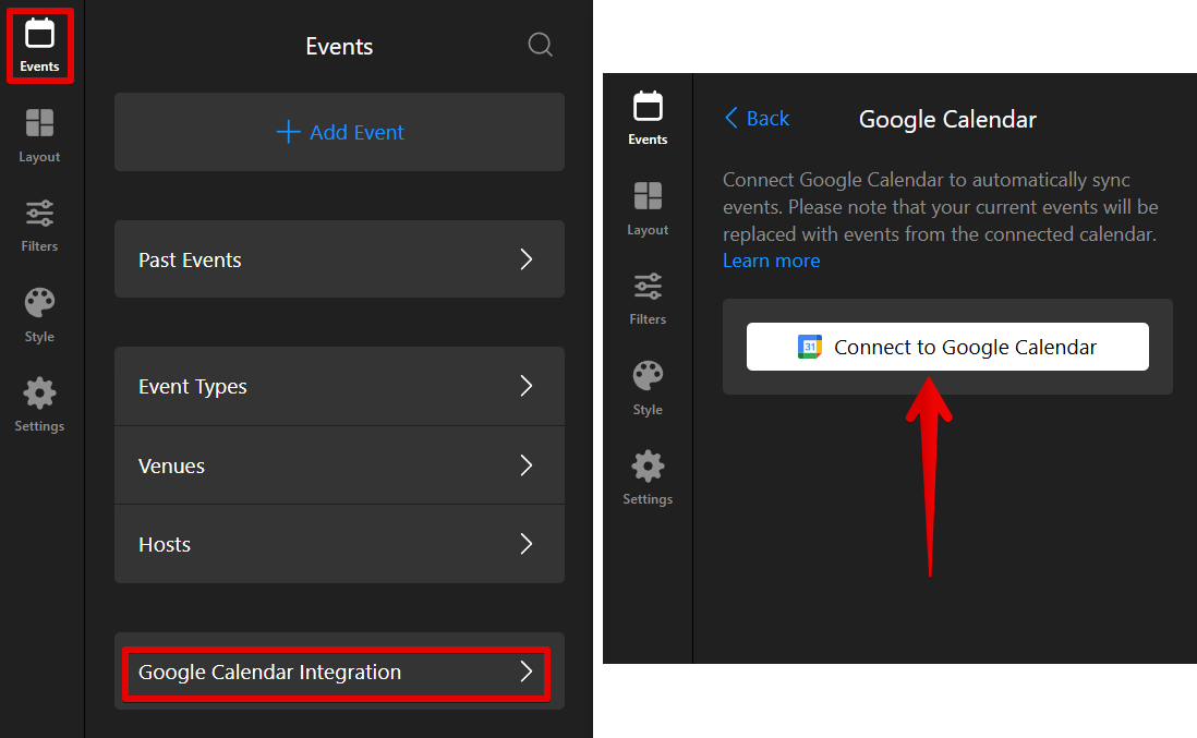Alternatively, if you’ve already added events manually, you can easily import them from Google Calendar by going to the Google Calendar Integration section: